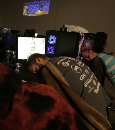 Across the room, everyone settled in. Some brought their own camping chairs, and coolers packed with food. Some had special speakers; some had special head phones. A group of friends from Allen, Texas, removed their shirts and donned only professional wrestling style tights — in florescent colors and vibrant patterns. Between their computers was a stick of deodorant, a handful of 5-hour-energy drinks, and a box of oatmeal crème cookies. They were playing "League of Legends," and any time one of them lost a life in the game, he’d have to drop to the cement floor and loudly count off a set of 10 pushups.
