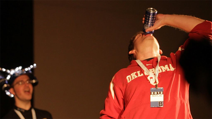 Up next was Cosmic Cow. Before shooting the BAWLS, he yelled to the crowd: "Boomer Sooner!" He carefully poured the shots, then lined them all up. He dropped both shots and the cold can in just about 11 seconds, but when he flipped his can over, there was foam. The judges added two seconds to his time, making KenCo the champion once again.