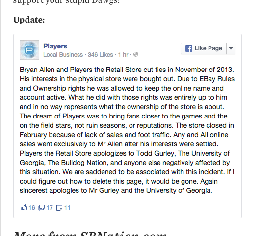 And after the game: "Obligitory game post.... Yay....UGA won. Now come to my store and support your stupid Dawgs!"